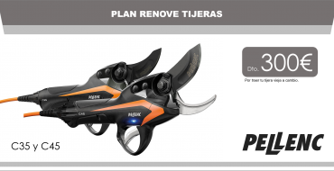 Te descontamos hasta 300€ en la compra de unas tijeras nuevas Pellenc de los modelos C35 y C45 si nos traes tu tijera vieja a cambio.